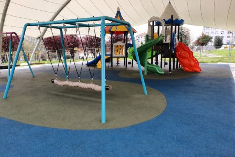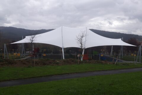 Confección e instalación de una Cubierta Textil en forma de arco de 25 x 21 mts para cubrir un Parque infantil en el parque Uribe, Derio (Vizcaya). Diseño en doble arco inclinado de acero zincado. Cubierta textil tipo II, 900 grs.