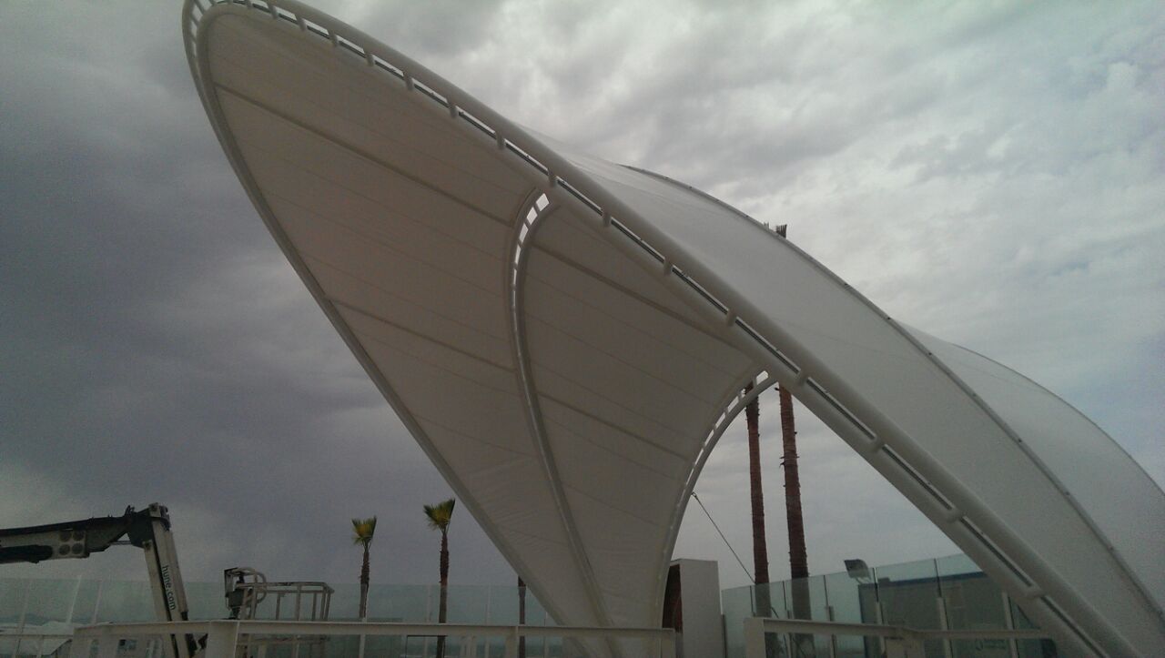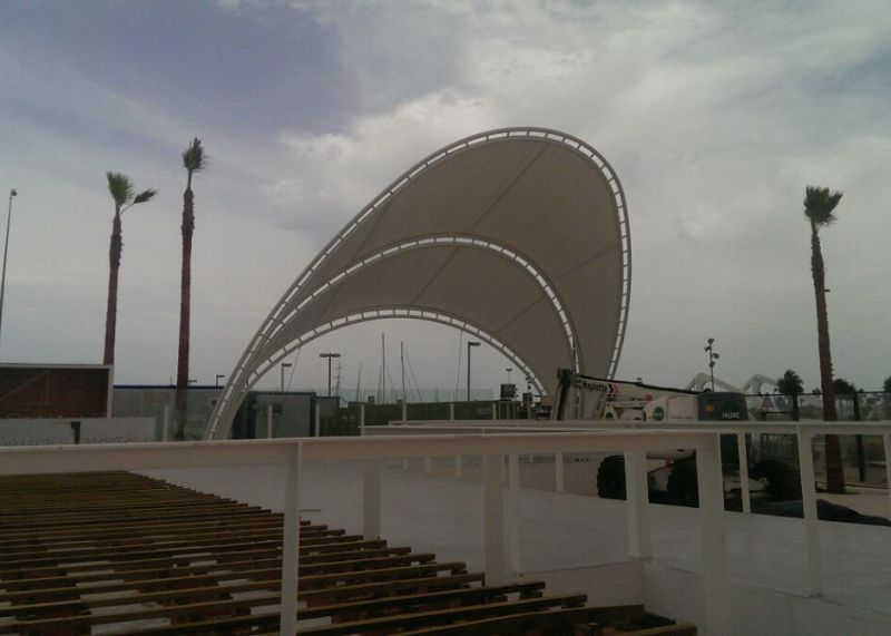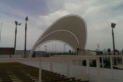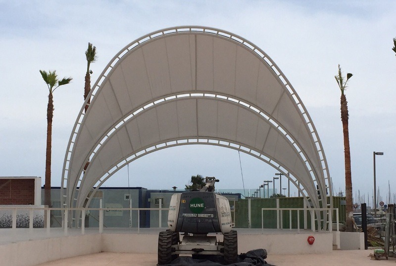 Os presentamos un proyecto espectacular para el escenario de la discoteca al aire libre más grande del Levante. Ubicada frente a la playa de la Malva-Rosa de Valencia, en el Marina Beach Club. Se trata de una Membrana Textil Tensada sobre una estructura en arco de 12 mts de altura, con un ancho de 14mts. Obra diseñada, calculada, confeccionada e instalada por el equipo de Carpatec®